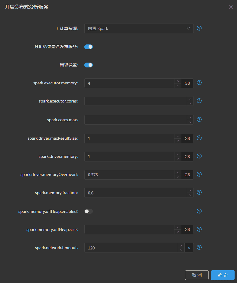 如果使用内置Spark,则在高级设置中可设置以下参数: