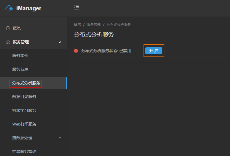 - 点击页面左侧导航栏服务管理->分布式分析服务;