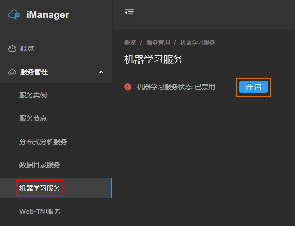 GIS云套件支持一键开启机器学习服务,请参考以下步骤开启机器学习服务:
