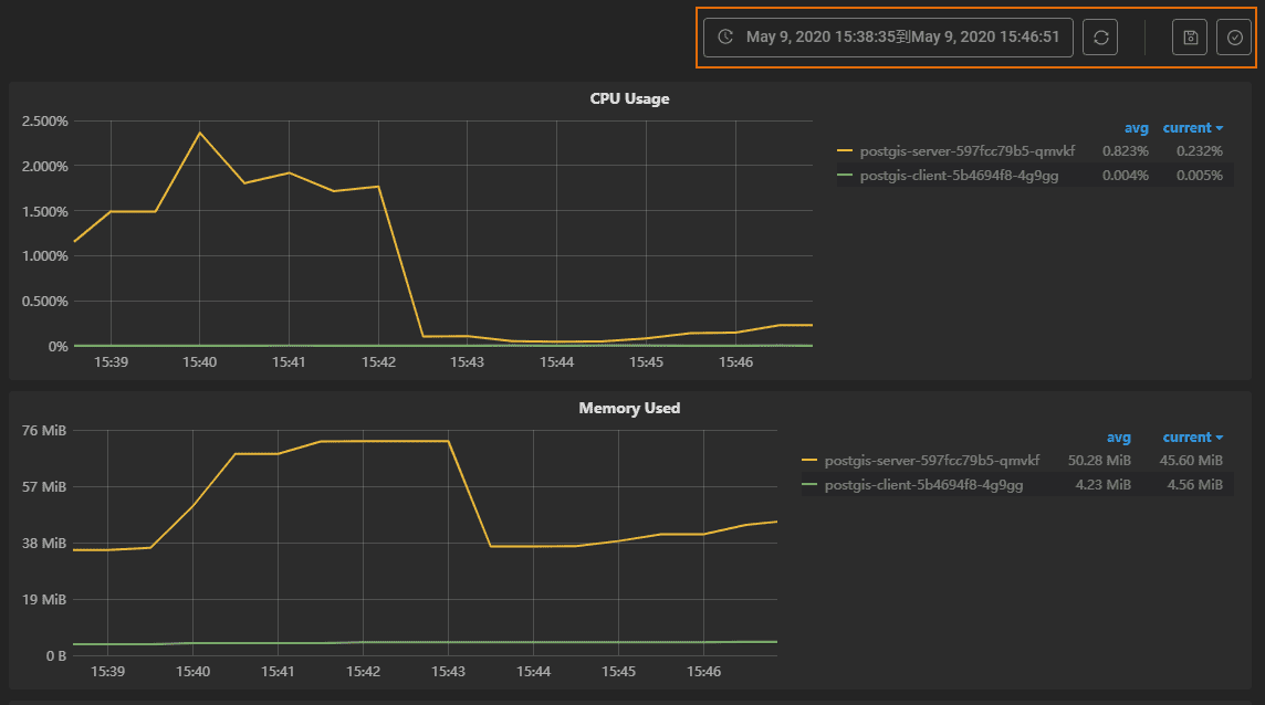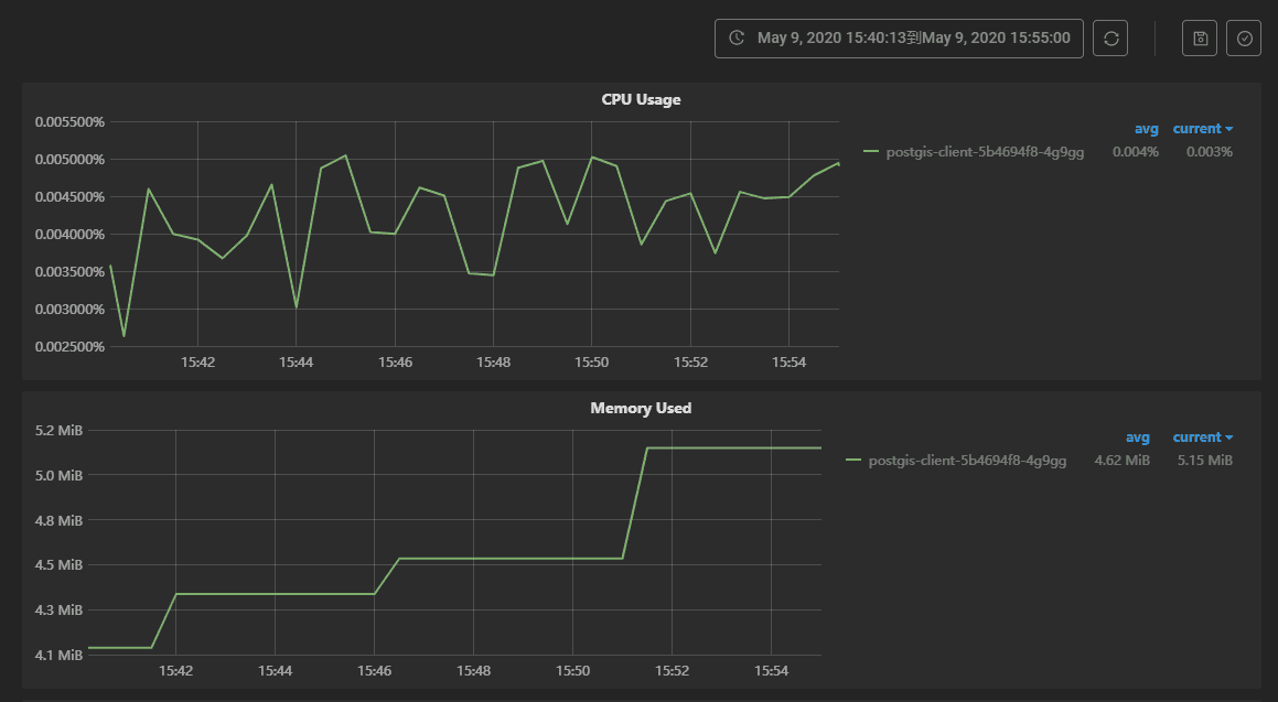 PostGIS环境运行状态统计图如下图所示。通过该页面可监控各服务的CPU使用率,内存占用量,网络接收速率,网络传输速率,磁盘占用量等实时情况。点击图例中的服务名称可单独监控相应服务。用户可对监控面板进行放大或缩小,随意拖拽面板以调整页面布局。除此之外,还可在监控页面进行如下操作: