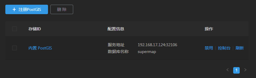 用户可在该页面查看配置信息、删除外接PostGIS、禁用内置PostGIS、通过控制台进入内置PostGIS服务列表页面。