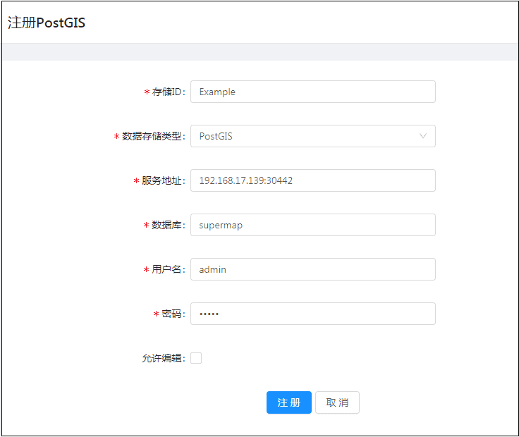 - 存储ID(必填):PostGIS环境的名称,可自定义。