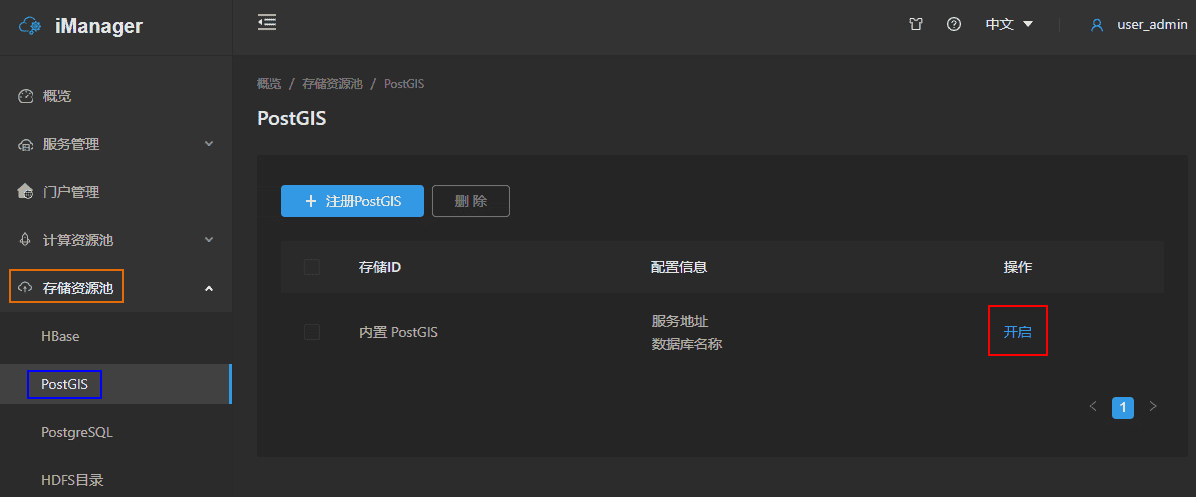 - 打开左侧导航栏存储资源池,点击PostGIS;