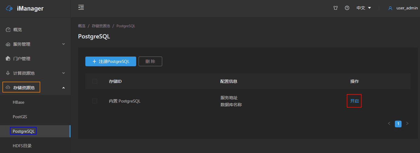 - 打开左侧导航栏存储资源池,点击PostgreSQL;