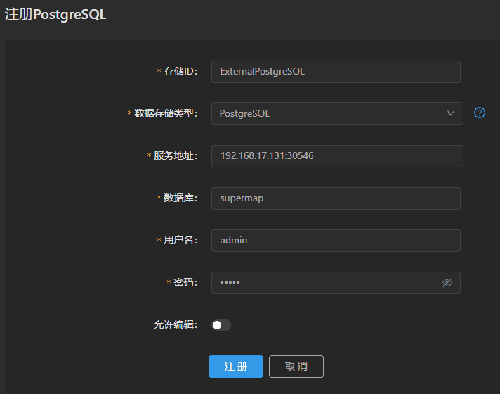 - 允许编辑:是否允许编辑,默认不可编辑。若允许编辑,则该数据库可作为数据目录服务上传关系型数据的存储节点。
