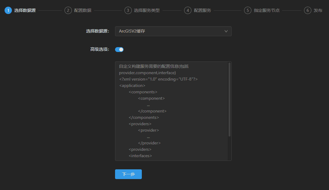登录GIS云套件,点击iManager首页->系统管理进入iManager管理页面;点击左侧导航栏服务管理->服务实例;点击页面发布服务。选择数据来源ArcGISV2缓存,点击下一步。