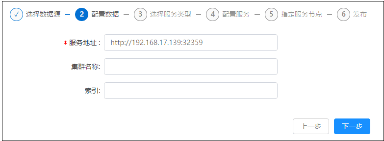 登录GIS云套件,点击iManager首页->系统管理进入iManager管理页面;点击左侧导航栏服务管理->服务实例;点击页面发布服务。选择数据来源Elasticsearch服务,点击下一步。