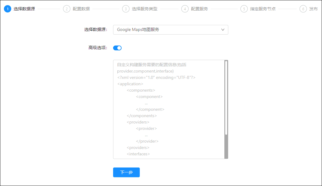 登录GIS云套件,点击iManager首页->系统管理进入iManager管理页面;点击左侧导航栏服务管理->服务实例;点击页面发布服务。选择数据来源Google Maps地图服务,点击下一步。