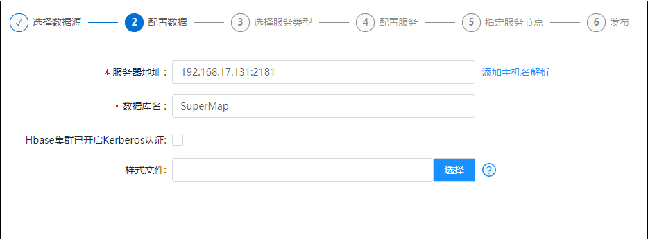 - 添加主机名解析:如果不是使用GIS云套件内置的HBase,请添加主机名解析。详细介绍参见GIS云套件->配置管理->主机名解析。