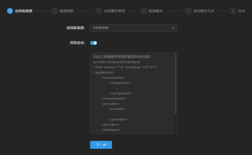 登录GIS云套件,点击iManager首页->系统管理进入iManager管理页面;点击左侧导航栏服务管理->服务实例;点击页面发布服务。选择数据来源VTPK文件,点击下一步。