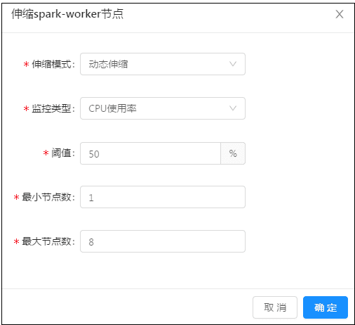 - 动态伸缩:用户设置相应的指标,Spark集群环境会根据负载情况自行伸缩节点个数。例:如上图,当spark-worker节点的CPU使用率高于50%,Spark集群环境会在计算后自动增加spark-worker节点个数,若增加spark-worker节点后平均CPU使用率仍高于50%,则会在一段时间后继续增加spark-worker节点,直至增加到8个;当平均CPU使用率低于50%,Spark集群环境会自动减少spark-worker节点,直至节点个数为1。