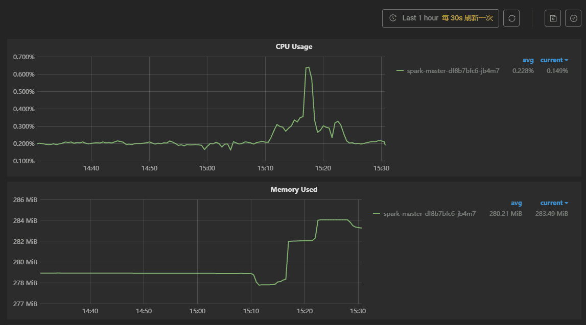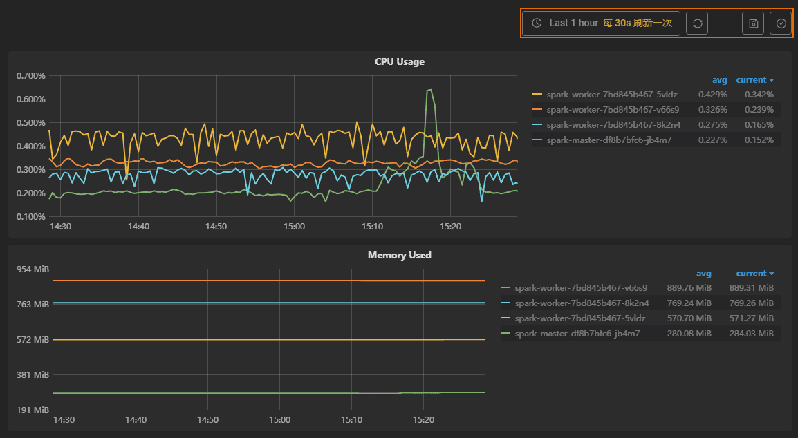 点击服务名称即可进入Spark集群详情页面,其容器运行状态统计图如下图所示。通过该页面可监控单个容器的CPU使用率,内存占用量,网络接收速率,网络传输速率,磁盘占用量等实时情况。用户可对监控面板进行放大或缩小,随意拖拽面板以调整页面布局。除此之外,还可保存页面样式、管理版本、设定监控时间段、设定自动刷新时间及手动刷新,详情请参见环境监控页面功能介绍。