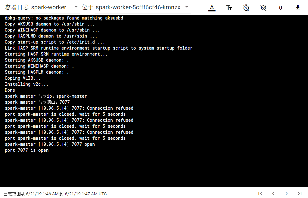点击容器列表中的日志可进入容器日志界面,该日志记载了容器运行的过程以及运行状态,如下图。
