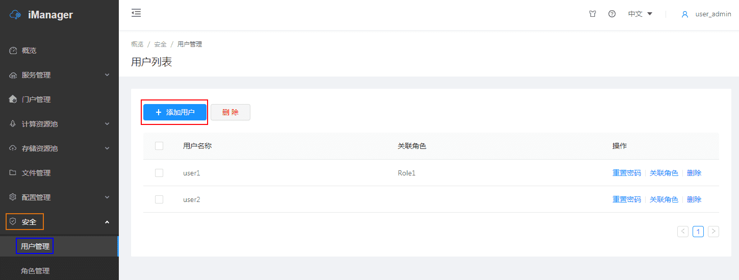 在用户管理界面,用户列表中罗列了包括管理员用户在内的所有用户,管理员可在该列表中重置用户密码、改变用户关联角色以及删除用户。