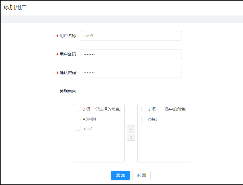 在关联角色处左侧方框内选择该用户的角色并添加至右侧方框,若无关联角色可不添加;