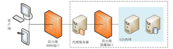 对GIS系统的保护还可以通过设置多道防火墙来实现,多道防火墙之间会形成隔离区(相对于内网,可以称为外围网络),在此区域可以设置反向代理服务器,从而使 GIS 服务器更加安全,如下图。