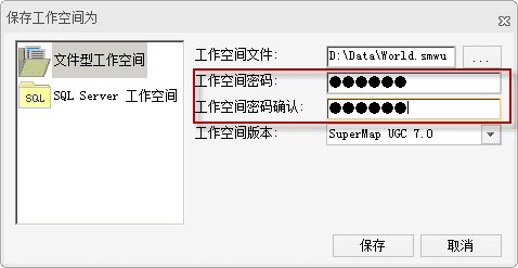 GIS工作空间存储了一个工程项目(同一个事务过程)中所有的数据源、地图的组织关系,使用SuperMap iDesktop制作的地图,均保存在工作空间中。GIS工作空间保存时,可设置密码,以保障数据安全。如果是数据库型工作空间,则可通过数据库账户(用户名称、用户密码)来确保数据安全,如下图。