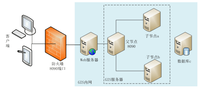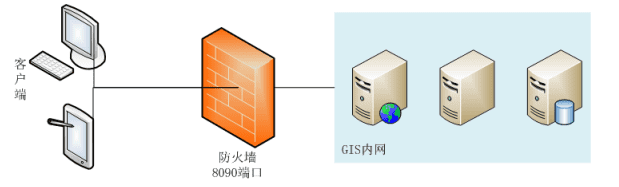 GIS系统(包括数据、Web 应用等)设置在内网中,使用一道防火墙将内网和外网分隔,内外网之间仅通过固定端口进行通信,如下图。不管是Windows还是Linux系统,都应该开启系统防火墙,只允许必要的端口通过。常用的必要端口有: