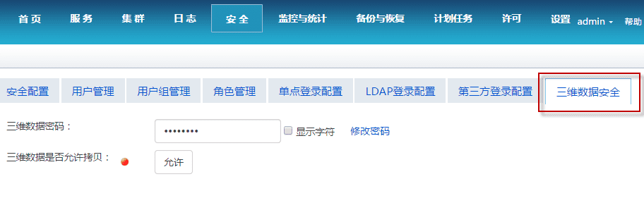 在SuperMap iServer 中启动三维服务后,会自动生成一个随机的加密密码。SuperMap iClient 客户端浏览三维服务时会缓存三维数据并使用服务端生成的密码自动对下载的三维数据进行加密。 服务器端管理员可以修改这个默认的加密密码,并可设置三维缓存数据是否允许拷贝,如下图。