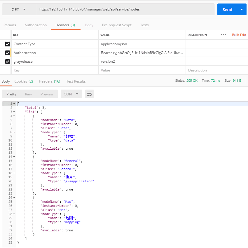 http://192.168.17.145:30704/manager/web/api/service/nodes执行GET请求,获取服务节点信息,请求方法介绍请参见GIS云套件->API->service->nodes->GET。在请求头中输入token,获取token的方法请参见GIS云套件->API->tokens;新增请求头“grayrelease”,匹配值“version2”。 -