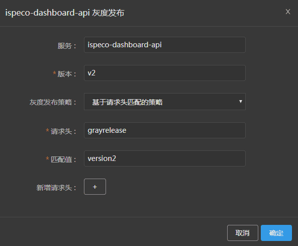 输入版本“v2”,选择灰度发布策略“基于请求头匹配的策略”,输入请求头“grayrelease”,输入匹配值“version2”,点击确定;
