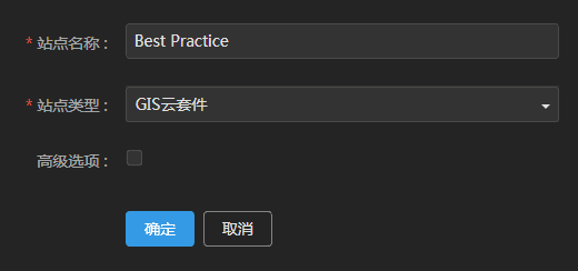输入站点名称“Best Practice”,在站点类型中选择GIS云套件,点击确定进行创建;