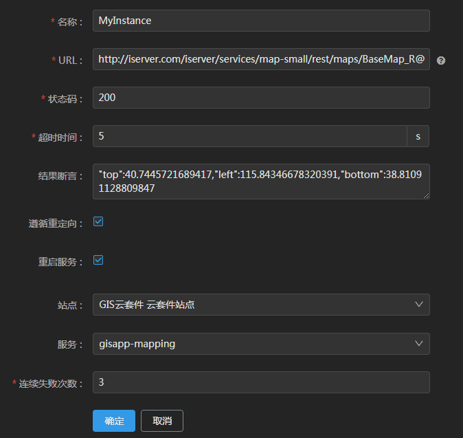 http://iserver.com/iserver/services/map-small/rest/maps/BaseMap_R@small.json设置结果断言 “top”:40.7445721689417,“left”:115.84346678320391,“bottom”:38.81091128809847。当返回值如下时,符合预期。{ "viewBounds": { "top": 40.7445721689417, "left": 115.84346678320391, "bottom": 38.81091128809847, "leftBottom": { "x": 115.84346678320391, "y": 38.81091128809847 }, "right": 117.77712766404714, "rightTop": { "x": 117.77712766404714, "y": 40.7445721689417 } }, ... - 遵循重定向:勾选后,若URL发生重定向,自动监控重定向的URL。不勾选,若URL发生重定向,继续监控原URL。