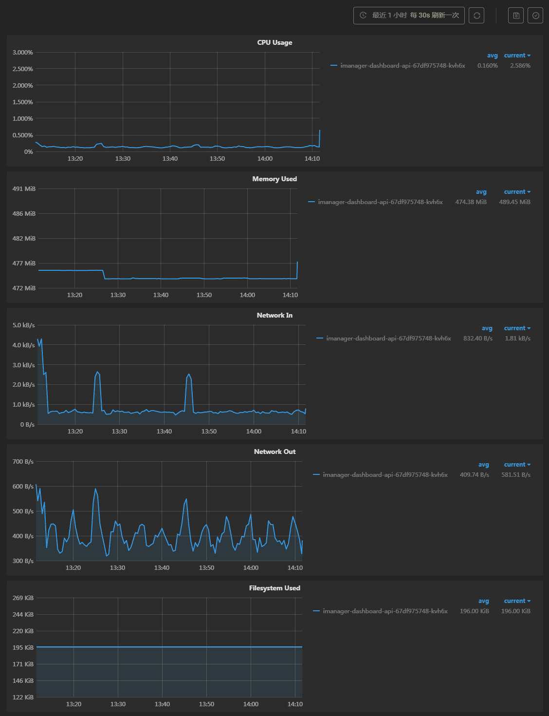 指定容器运行状态统计图如下所示。通过该页面可监控单个容器的CPU使用率,内存占用量,网络接收速率,网络传输速率,磁盘占用量等实时情况。管理员可随意拖拽面板以调整页面布局、改变面板大小。除此之外,还可保存页面样式、管理版本、设定监控时间段、设定自动刷新时间及手动刷新,请参见环境监控。