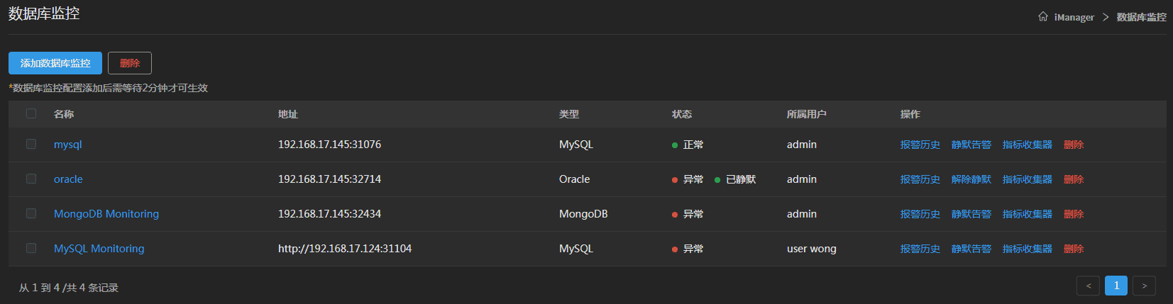 - 删除:删除数据库监控。