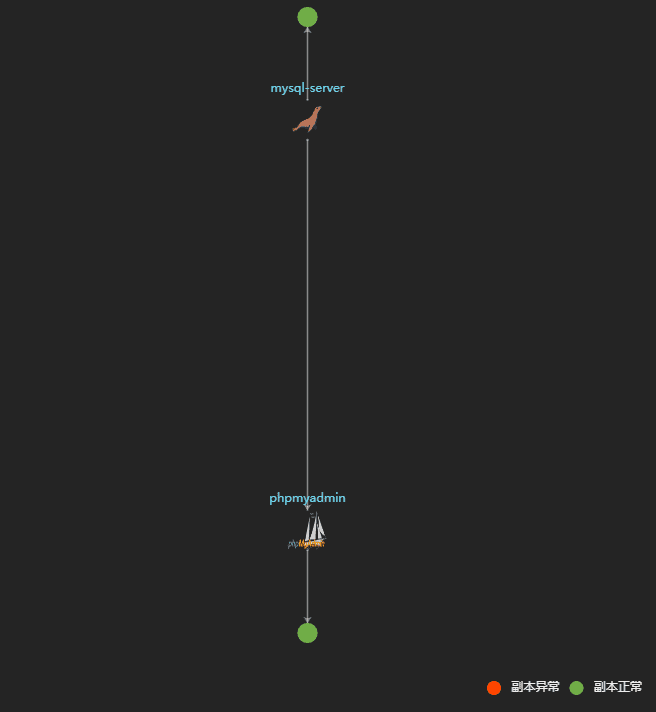 MySQL拓扑图便于了解服务间的关联。其中,MySQL-server、PhpMyAdmin用专属图标表示;圆形图案代表服务节点(当服务伸缩时,可看见一个服务拥有多个圆形节点),绿色圆表示服务节点运行正常,红色圆表示节点服务不可用。拓扑图支持放大缩小。将鼠标放置任意图案上方,与该图有关的关联图案会突出显示,没有关联的会被隐藏。图案(图标)与图案(图标)间以箭头和文字的方式对关联进行解释。