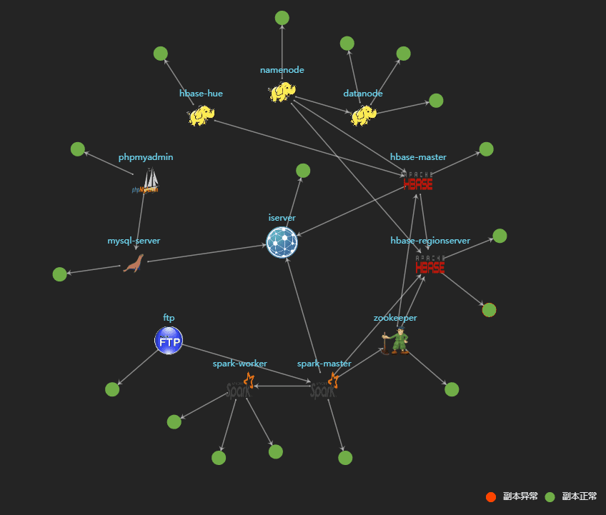 GIS大数据拓扑图便于了解服务间的关联。其中,iServer、Namenode、Datanode、HBase-master、HBase-regionserver、FTP、MySQL-server、Spark-worker、Spark-master、Zookeeper用专属图标表示;圆形图案代表服务节点(当服务伸缩时,可看见一个服务拥有多个圆形节点),绿色圆表示服务节点运行正常,红色圆表示节点服务不可用。拓扑图支持放大缩小。将鼠标放置任意图案上方,与该图有关的关联图案会突出显示,没有关联的会被隐藏。图案(图标)与图案(图标)间以箭头和文字的方式对关联进行解释。