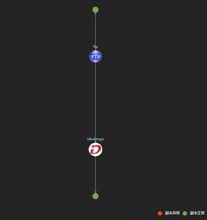 GIS桌面拓扑图便于了解服务间的关联,如下图。其中,FTP和iDesktopX用专属图标表示;圆形图案代表服务节点,绿色圆表示服务节点运行正常,红色圆表示节点服务不可用。拓扑图支持放大缩小。将鼠标放置任意图案上方,与该图有关的关联图案会突出显示,没有关联的会被隐藏。图案(图标)与图案(图标)间以箭头和文字的方式对关联进行解释。