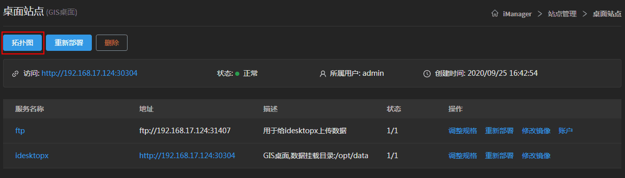 - 点击iManager左侧导航栏站点管理->您的GIS桌面名称进入页面;
