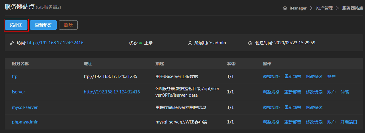 - 点击iManager左侧导航栏站点管理->您的GIS服务器名称进入页面;