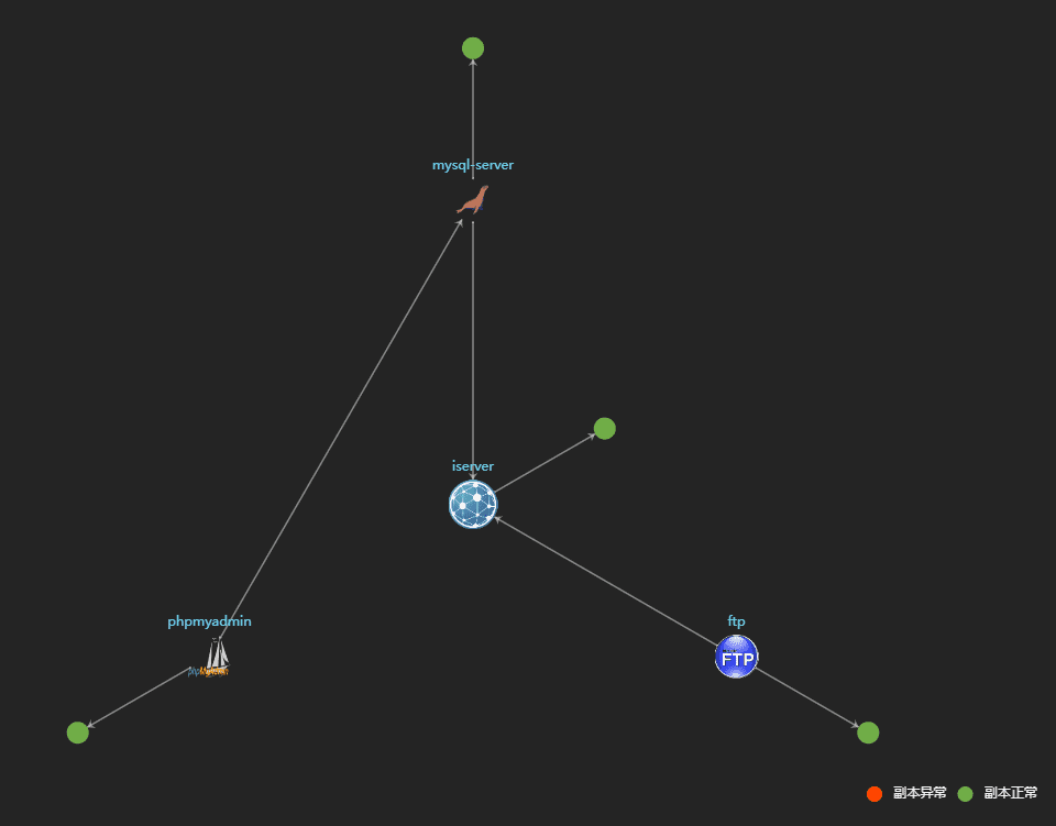 GIS服务器拓扑图便于了解服务间的关联,如下图。其中,iServer、MySQL-server、FTP、Phpmyadmin用专属图标表示;圆形图案代表服务节点(当服务伸缩时,可看见一个服务拥有多个圆形节点),绿色圆表示服务节点运行正常,红色圆表示节点服务不可用。拓扑图支持放大缩小。将鼠标放置任意图案上方,与该图有关的关联图案会突出显示,没有关联的会被隐藏。图案(图标)与图案(图标)间以箭头和文字的方式对关联进行解释。