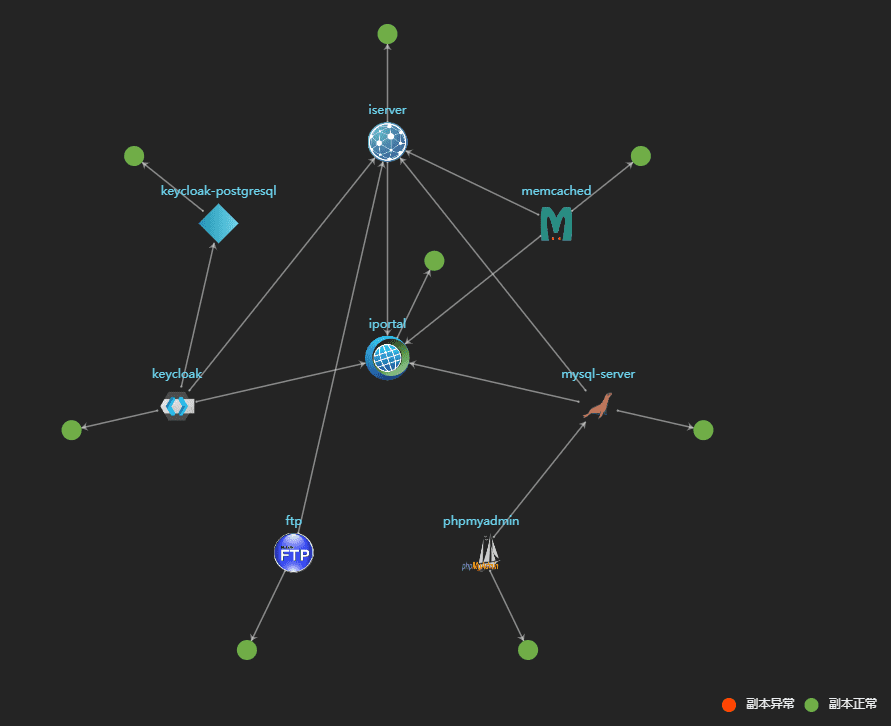 GIS站点拓扑图便于了解服务间的关联。其中,iServer、iPortal、Keycloak、FTP、MySQL-server、Memcached、Phpmyadmin用专属图标表示;圆形图案代表服务节点(当服务伸缩时,可看见一个服务拥有多个圆形节点),绿色圆表示服务节点运行正常,红色圆表示节点服务不可用。拓扑图支持放大缩小。将鼠标放置任意图案上方,与该图有关的关联图案会突出显示,没有关联的会被隐藏。图案(图标)与图案(图标)间以箭头和文字的方式对关联进行解释。