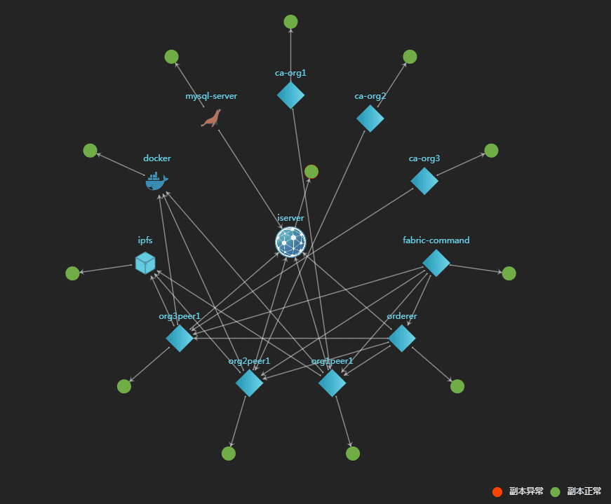 空间区块链拓扑图便于了解服务间的关联。其中圆形图案代表服务节点,绿色圆表示服务节点运行正常,红色圆表示节点服务不可用。拓扑图支持放大缩小。