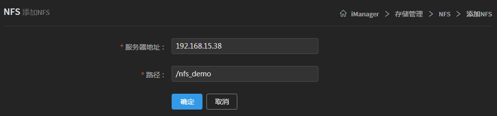 图中服务器地址与路径为示例,请根据您实际NFS服务器地址与路径填写。
