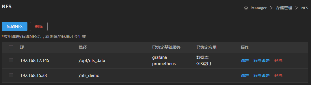 打开iManager左侧导航栏存储管理,点击NFS进入页面。在NFS列表中,可删除现有NFS,可将服务和应用数据存入指定的NFS中,可解除服务和应用数据与NFS的绑定。