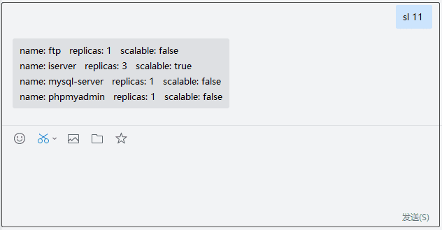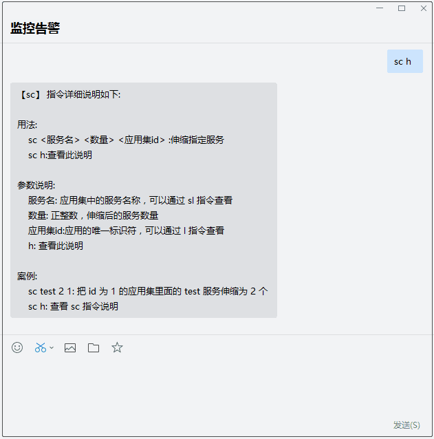 sc h如上图所示,【sc】指令的作用为伸缩指定服务,即对某一服务横向扩展。执行【sc】指令所需的参数有服务名、伸缩后的服务数量、应用集ID。其中,服务名可输入【sl】指令获取;伸缩后的服务数量由管理员按需求决定;应用集ID可输入【l】指令获取(上图中参数说明部分有提示)。