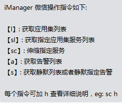 获取iManager微信操作指令指南,发送【h】(可输入除基本指令以外任意字母、中文、符号等,所得结果与输入【h】一样):