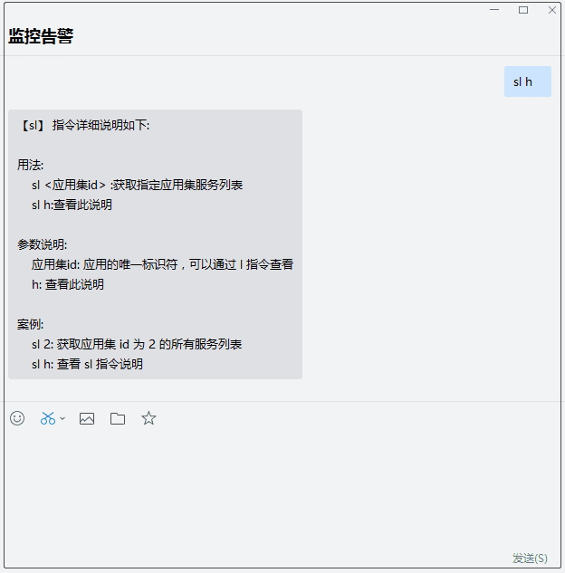 从说明中得知,【sl】指令的作用为获取应用集服务列表,即获取某一应用集所有服务。执行【sl】指令所需的参数为应用集ID,可通过【l】指令获取(参数说明部分有提示)。