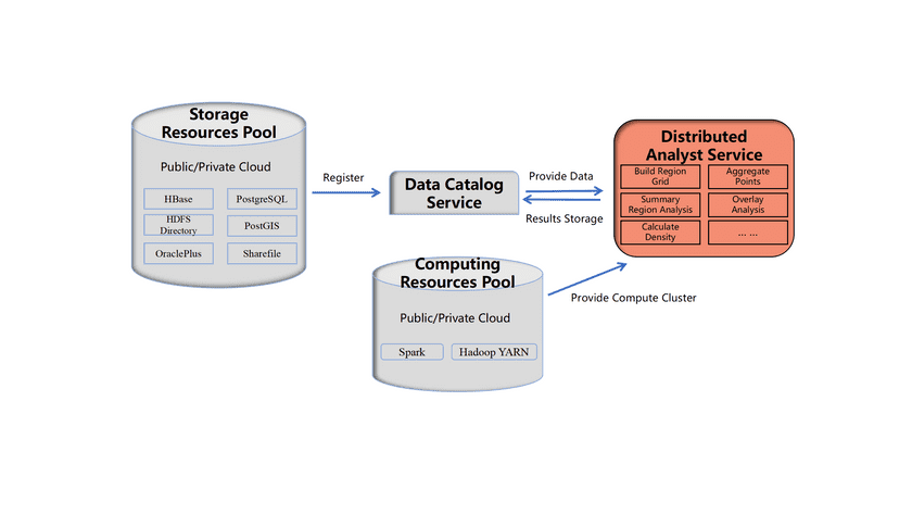 GIS Cloud Suite provides Distributed Analyst Service. The distributed storage data is allowed to upload and use in GIS Cloud Suite, including the relational datasets from HBase, PostGIS, and PostgreSQL, as well as the csv and index files from HDFS. The distributed analyst service has the ability of spatial analyst, such as big data map outputting and distributed dynamic outputting. All the functions provide REST API, it is easy to develop and extend. As the screenshot below, the Distributed Analyst Service is supportted by Data Catalog Service(refer to GIS Cloud Suite > Service Management > Data Catalog Service), Computing Resources(refer to GIS Cloud Suite > Computing Resources), and Storage Resources(refer to GIS Cloud Suite > Storage Resources).