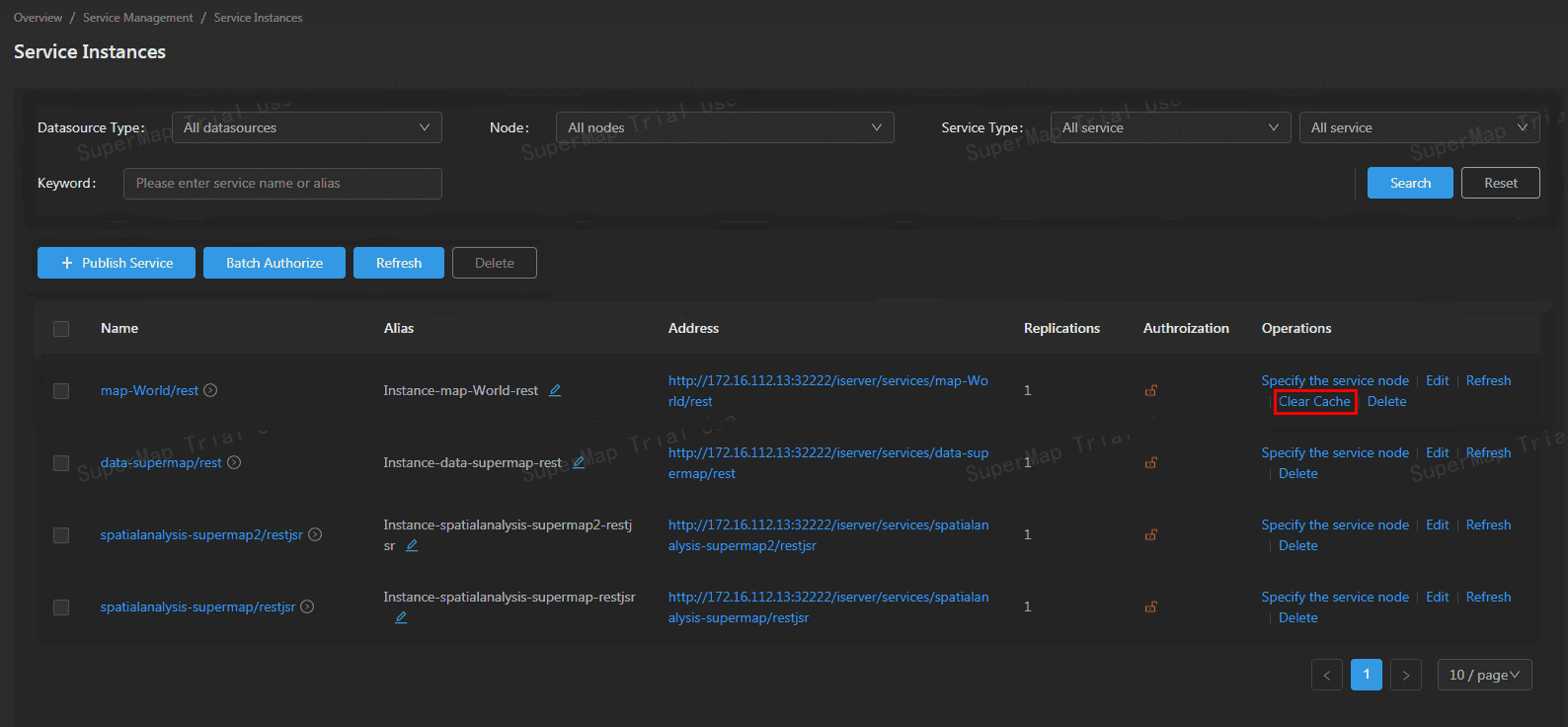- Clear Cache: Clear map caches of the service instance. Note: This function is only available for REST Map Services whose datasource are not belong to Tile type.
