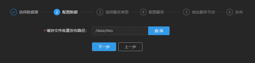 登录GIS云套件,点击iManager首页->系统管理进入iManager管理页面;点击左侧导航栏服务管理->服务实例;点击页面发布服务。选择数据来源批量缓存文件,点击下一步。