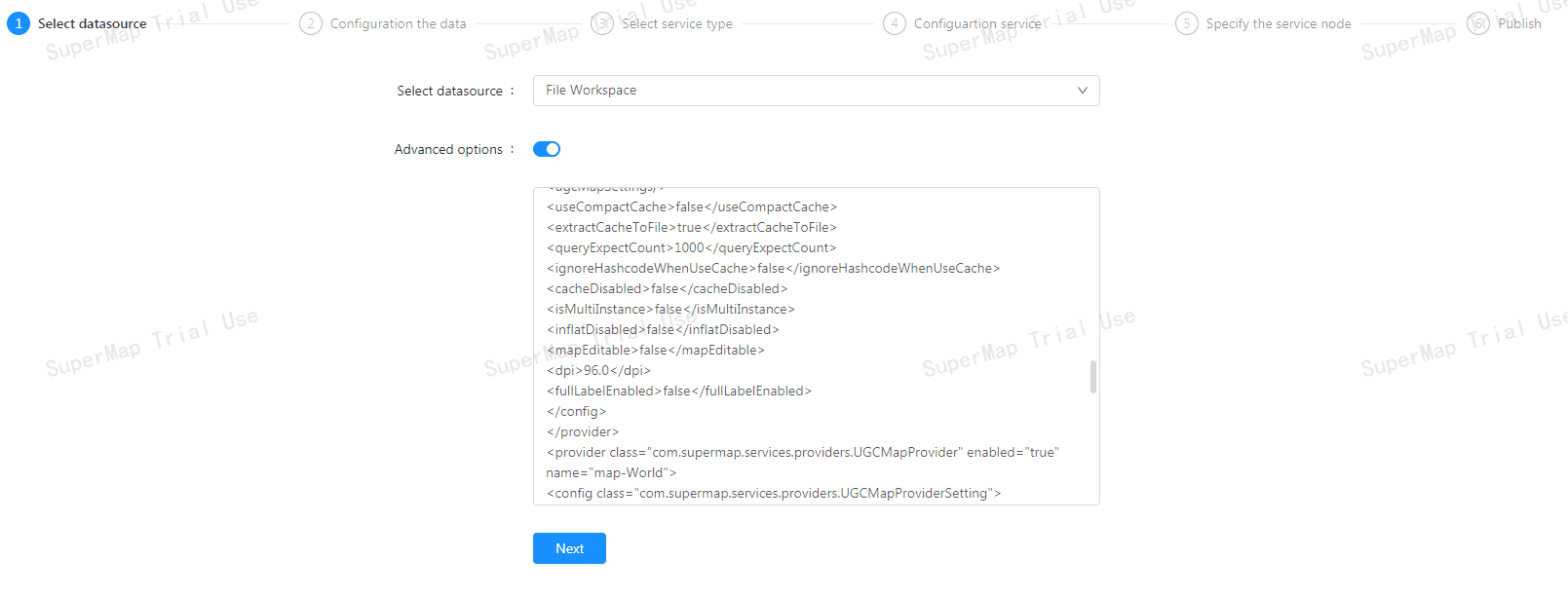 - Log into the GIS Cloud Suite, click iManager Home -> System Management to enter the iManager Management page; Click Service Management> Service Instances in the left navigation bar. Click Publish Service on the page. Turn on Advanced options, fill in the input boxes with configuration information needed for building an aggregated service, such as provider, component, interface, etc. For specific construction methods, refer to SuperMap iServer Help->Configuration and management->Configuration and managing GIS Services->Configuration for service aggregation, and then click Next in sequence.