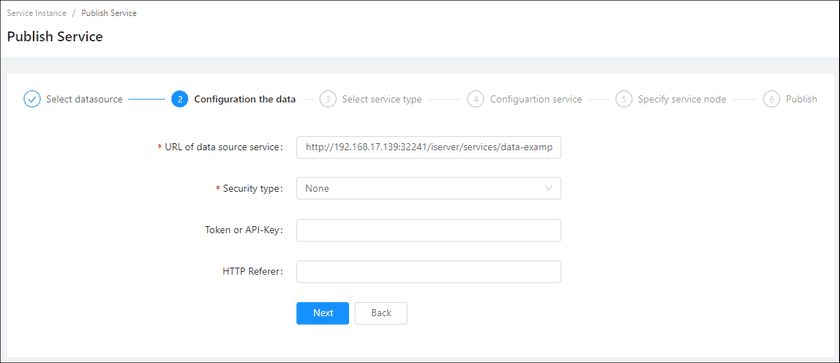 - URL of datasource service(Required): The URL of the service you would used to publish.