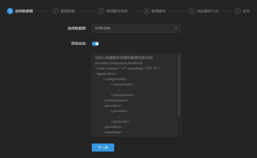 登录GIS云套件,点击iManager首页->系统管理进入iManager管理页面;点击左侧导航栏服务管理->服务实例;点击页面发布服务。选择数据来源VTPK文件,点击下一步。