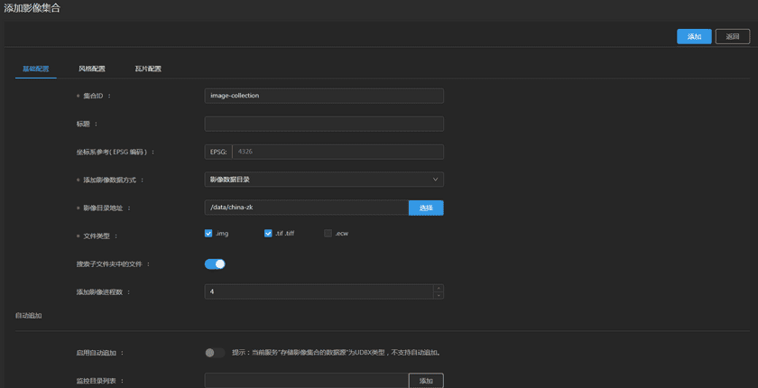 - 基础配置:可以对已有的影像服务通过添加影像集合的方式追加影像数据,还可以按需启用自动追加能力,监控影像数据目录并自动追加新增影像。详细介绍请参考SuperMap iServer在线帮助(请参见[开始->使用iServer->使用影像服务->添加影像集合])。