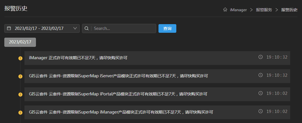 SuperMap iManager提供报警服务,支持查看报警历史信息。用户可通过报警服务->报警历史查看历史报警记录。